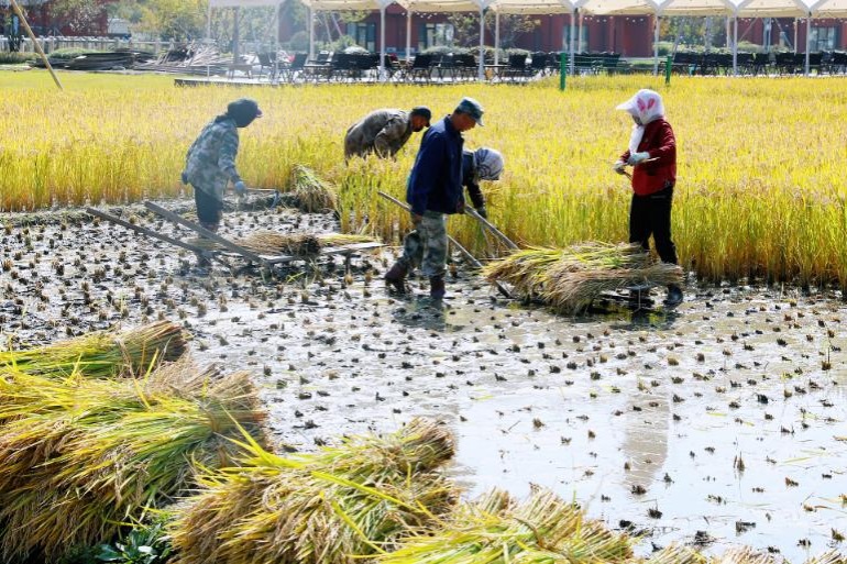 - Jilin farmers harvest golden rice in autumn fields
