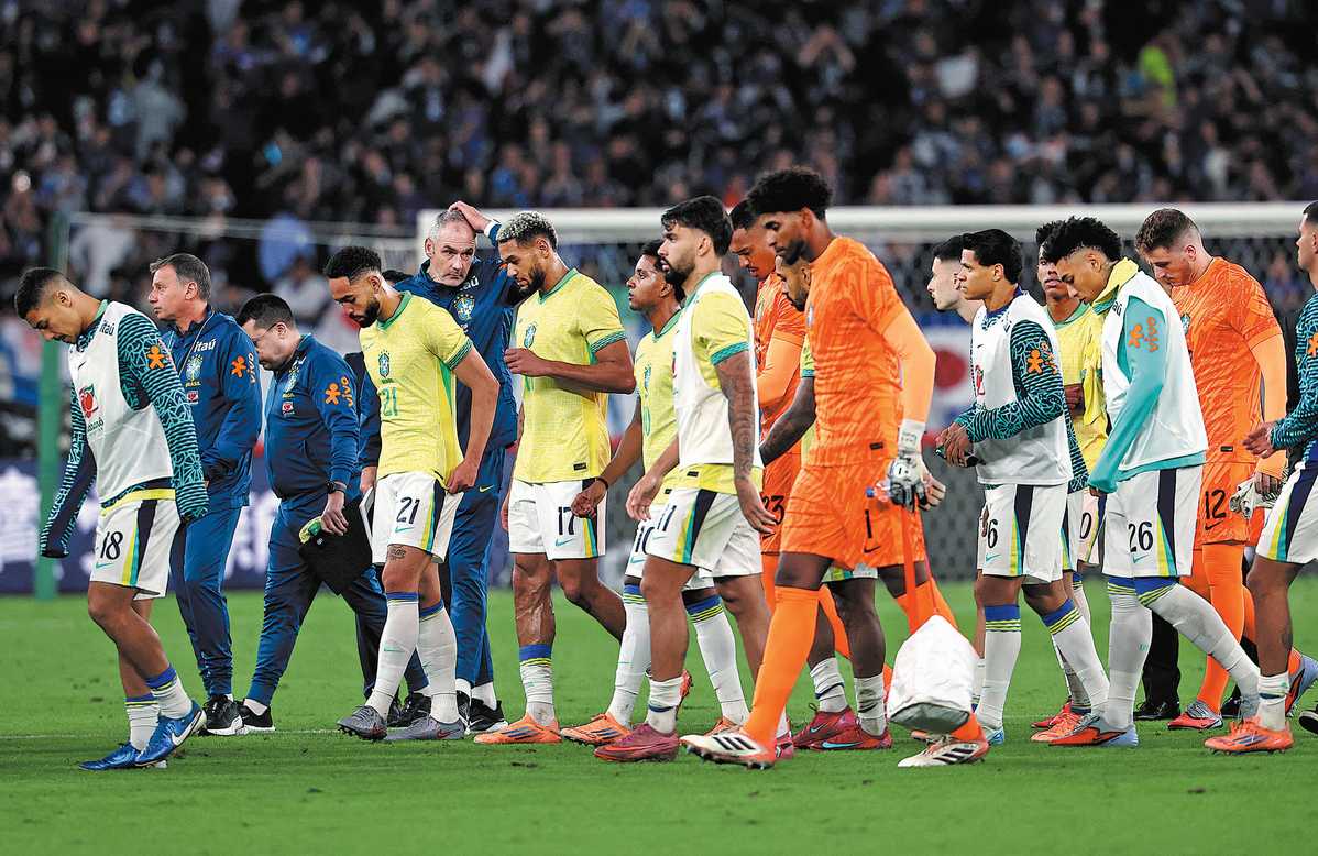 Disconsolate Brazil players leave the field after the team suffered its first-ever loss to Japan in Tokyo on Tuesday. REUTERS