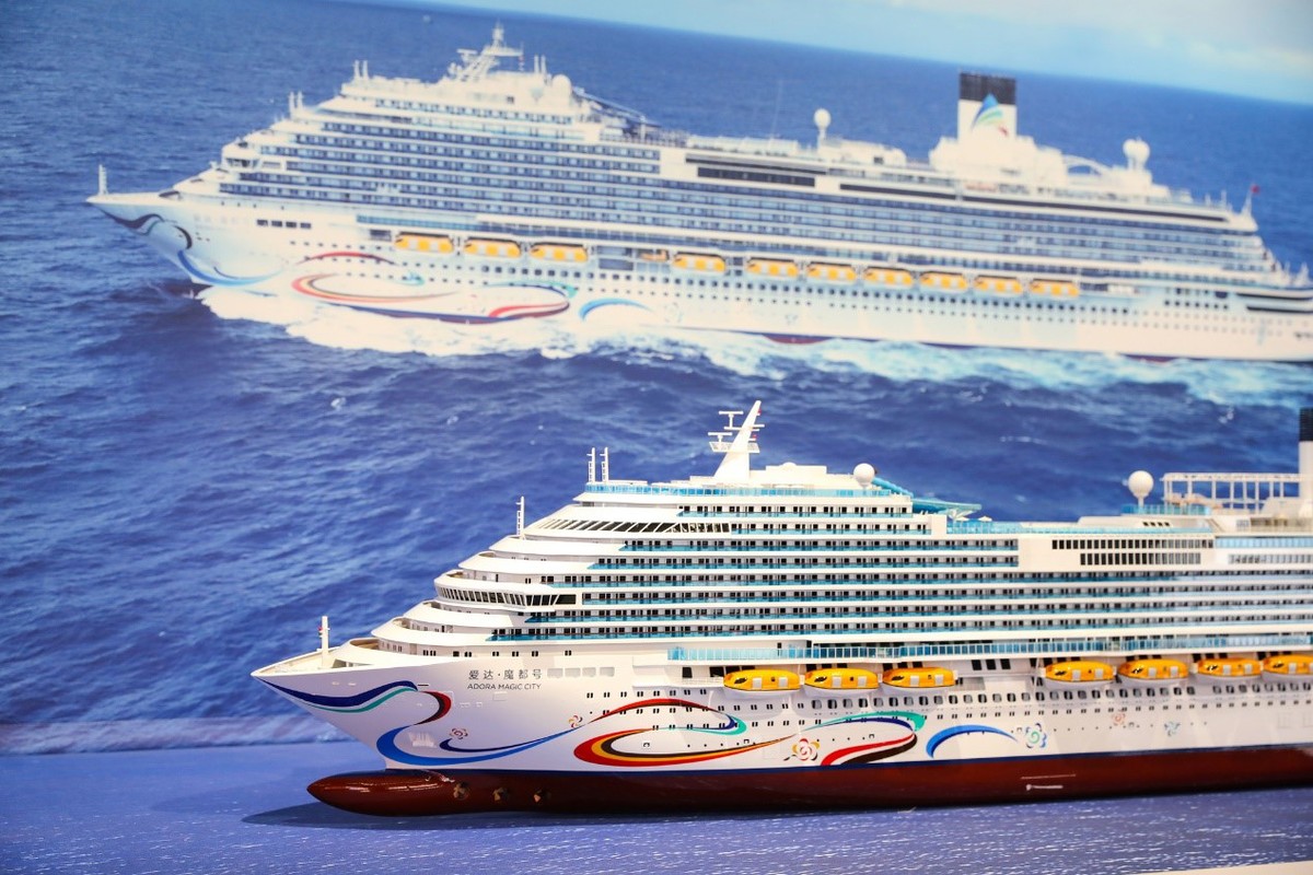 A detailed model of the Adora Magic City cruise ship is on display. [Photo/VCG]