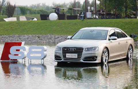 FAW-Audi Sales Division General Manager Dominique Boesch (right) introduces the Audi brand's century long history at the launch event of the new Audi A8 series on Aug 18, 2014, in Beijing. [Photo provided to chinadaily.com.cn]