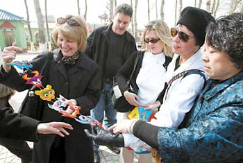 Pamela Luecke (left) and other US newspaper editors admire handicrafts in the southern suburbs of Beijing as Zhang Guanghui (right), deputy director of Liuminying Farm, explains the significance of Chinese zodiac science. The American Society of Newspaper Editors is making its first trip since 1978 to Beijing and Shanghai, meeting senior Chinese officials and visiting places of interest to gain more insight into China. [China Daily]