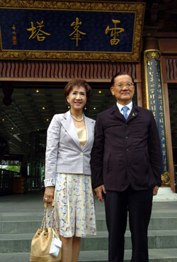 Lien Fang-yu pose for photographer in front of Leifeng Pagoda in Hangzhou,