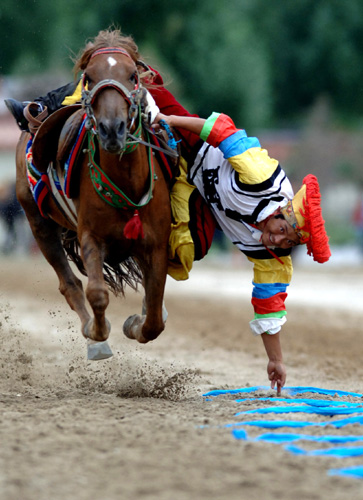 A member of the Tibetan equestrian sport team performs at the Shoton Festival in Lhasa, capital of southwest China's Tibet Autonomous Region on August 14, 2007. The Festival, which dates back to the 11th century as a religious activity for pilgrims to serve yogurt to monks and nuns who finished their summer retreat, had gradually become a theatrical event by mid-17th century. The Shoton Festival was inscribed on the list of China Intangible Cultural Heritage in May last year. [Xinhua]
