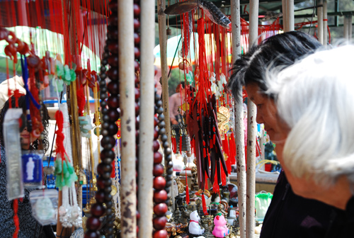 Customers select souvenirs at a market outside of Zhongyue Temple. [Chinadaily.com.cn]