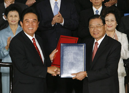 Chen Yunlin (L), president of the mainland's Association for Relations Across the Taiwan Straits, exchanges signed agreements with Straits Exchange Foundation Chairman P.K. Chiang during a cross-Straits meeting signing ceremony at the Grand Hotel in Taipei November 4, 2008. [Agencies]