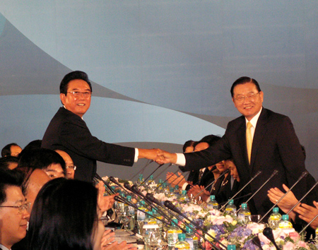 Chen Yunlin (left), president of the Chinese mainland's Association for Relations Across the Taiwan Straits and his island counterpart Chiang Ping-kung, chairman of the Straits Exchange Foundation shake hands before their historic talks in Taipei, November 4, 2008. [chinadaily.com.cn/By Xing Zhigang]