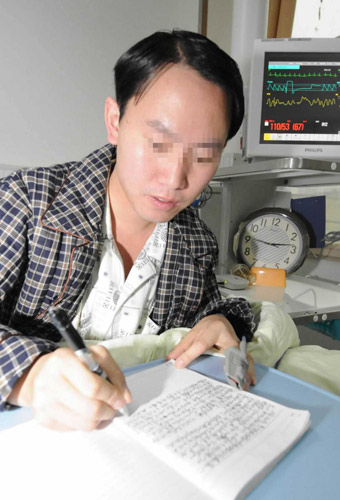 The bird flu patient surnamed Zhou writes a diary before leaving the isolation ward at Guizhou Provincial People's Hospital in Guiyang, capital of Guizhou in southwest China, February 3, 2009. The 29-year-old man was hospitalized for fever on January 15 and was confirmed to be infected with bird flu on January 24. Doctors said on Feb. 2 that he was in stable condition.[Xinhua/Yang Ying]