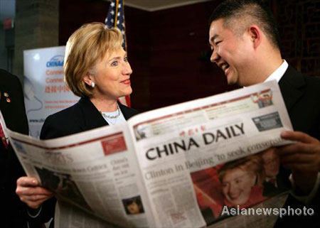 ![]() US Secretary of State Hillary Clinton (L) chats with Sun Shangwu, head of the news center of the China Daily newspaper before she conducts a web chat with Chinese internet users through chinadaily.com.cn in Beijing, February 22, 2009. [chinadaily.com.cn] |