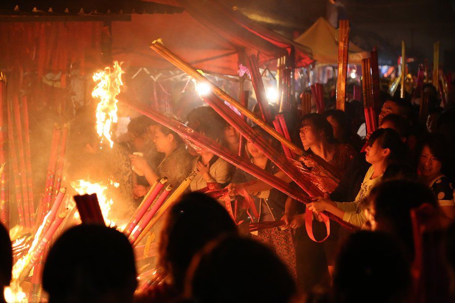 About 1,000 parents burn incense to pray for good luck for their children taking part in National College Entrance Examination on June 7, before a "magic tree" at zero hour in Liu'an city of East China's Anhui province, on June 1. [Photo/CFP]