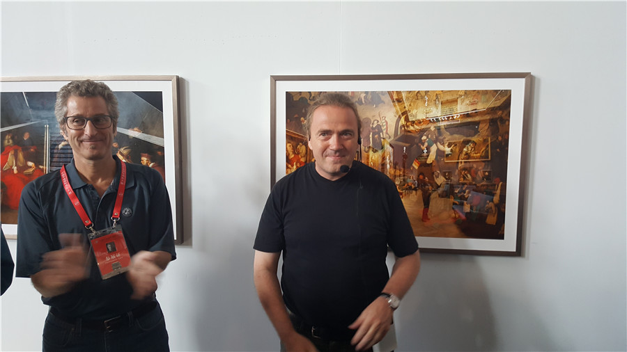 Two foreign photographers pose before artworks exhibited at the 2017 Pingyao International Photography Festival in North China's Shanxi province, Sept 20, 2017. Under the theme "With Original Inspiration, For a Brighter Future", 16,000 photos are on display at the festival, which was attended by over 2,000 photographers from 23 countries and regions. [Photo by Sun Ruisheng/ Provided to chinadaily.com.cn]