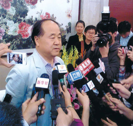 Books by Mo Yan are put on prominent display at the Frankfurt book fair on Thursday. Mo is the first Chinese national to win the Nobel Prize for Literature. Ralph Orlowski / Reuters |