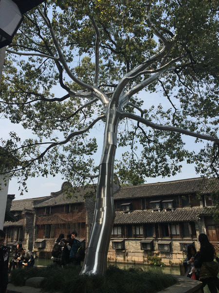 The tree covered in metal sheets is part of an art installation titled Armour by Finnish artist Antti Laitinen. He is one of the 40 artists from across the world taking part in the contemporary art show being held in the ancient water town of Wuzhen in East China's Zhejiang province.