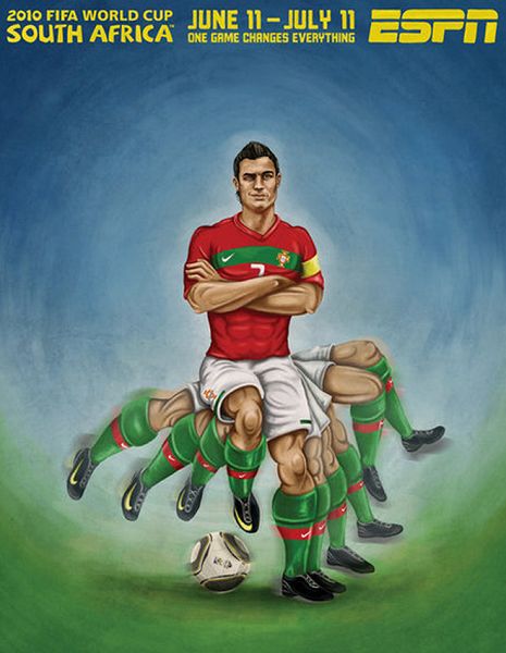 作為葡萄牙隊(duì)的頭號(hào)球星,C羅當(dāng)仁不讓地出現(xiàn)在了海報(bào)中央。而且繪畫者似乎受到了“千手觀音”造型的啟發(fā),也給C羅繪制了無數(shù)條腿,用這種方式來表現(xiàn)出他魔術(shù)般的腳法,同時(shí)給人以一種眼花繚亂的感覺。