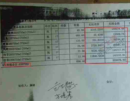 網(wǎng)上所公布的多張發(fā)票復印件顯示,此次被曝光的企業(yè)是“中國石油化工股份有限公司廣東石油分公司”,所進酒水多為“拉菲”等名貴洋酒及高價茅臺酒。其中,僅一瓶拉菲1996(750ml)的無稅進價就高達11846元。另一張貴州茅臺酒銷售有限公司所開的發(fā)票顯示,中石化廣東分公司一次性購買了近82萬元的茅臺酒。