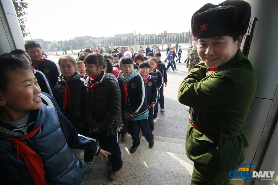 2013年3月5日,山東濟(jì)南黃臺(tái)小學(xué),學(xué)生家長(zhǎng)宋師傅一身“雷鋒”造型為學(xué)生站崗。當(dāng)日為學(xué)雷鋒紀(jì)念日,宋師傅希望通過此舉呼吁社會(huì)各界關(guān)注學(xué)生安全。(鄭濤 攝)