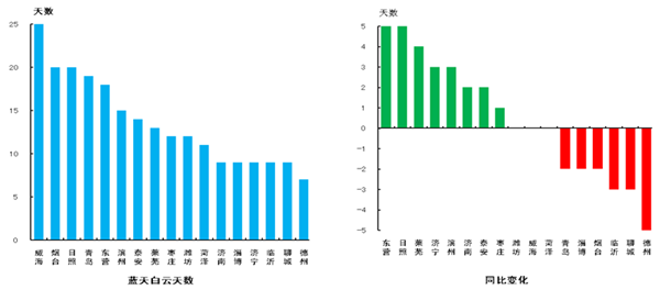 “藍天白云,繁星閃爍”天數(shù)最多的城市是威海,為25天,最少的是德州市,為7天?!八{天白云,繁星閃爍”天數(shù)同比增加最多的是東營市和日照市,增加5天;同比減少最多的是德州市,減少5天。