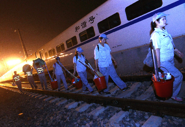 7月11日晚間10點(diǎn),鐵路上海虹橋站的保潔隊(duì)員正趕往進(jìn)站的動(dòng)車組,對(duì)列車進(jìn)行全面清潔。
