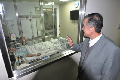 10月22日晚上九時許,正在輸入造血干細胞的王志鵬,向無菌倉窗外的思源骨髓基金管委會主任楊黎明招手致意。(圖片來自《今晚報》)