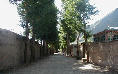 Across a small river by the linka is the Rabu Monastery, a temple of the Glupa or the Yellow Sect of Tibetan Buddhism. "That is a perfect conception of zoning," observes Liu Yuan, a Chinese consultant with APA, noting the river separates the monastery from the secular world of the village. This separation, in addition to the definition of the roads by trees, distinguishes it from most others in Tibetan areas that have been built around a monastery. The mastermind behind the village planning and tree planting was Jamyang Losong Kyanco, the 13th incarnation of the Living Buddha of the Rabu Monastery, after it was built by Dama Rergin Rinpoche, the first disciple of Tsong Khapa, the founding father of the Yellow Sect of Lamaism, in 1419. According to a local legend, says Qiuying Lanze, a Tibetan official of the prefecture government of Yushu, Dama Rergin Rinpoche had the temple built to fulfill one of Tsong Khapa's dreams.