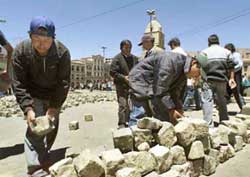 Bolivia calls for calm as revolt chokes La Paz ( 2003-10-15 09:51) (Agencies) Bolivia's embattled government appealed for calm on Tuesday as thousands of miners, peasants and farmers marched toward La Paz to join a popular revolt as the death toll in clashes with troops hit 53.