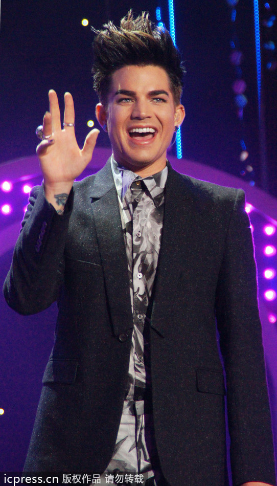 US singer Adam Lambert waves during a recording session of the first episode of the reality TV show "Chinese Idol" in Shanghai, China, 22 April 2013. [Photo/icpress]