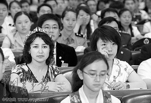 在團(tuán)十六大開幕式上,6名少先隊(duì)員代表向大會(huì)獻(xiàn)詞。當(dāng)一名來自四川地震災(zāi)區(qū)什邡市的小朋友說完災(zāi)區(qū)的情況,并表示有信心創(chuàng)造更美好的新生活時(shí),代表們流下了感動(dòng)的淚水。中國青年報(bào)記者李建泉攝