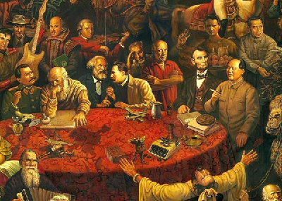 在103位名人中,中國領(lǐng)袖毛澤東坐在油畫正中間的圓桌邊抽煙,旁邊的美國前總統(tǒng)林肯似乎正在聆聽毛主席的話語,而毛主席身后站著的是周恩來總理。油畫中馬克思和列寧正進(jìn)行深入地交流;“一代天驕”成吉思汗與拿破侖并駕齊驅(qū);美國前總統(tǒng)布什手持望遠(yuǎn)鏡,而恐怖大亨本·拉登則悄然站在他身后;東條英機(jī)跪在秦始皇面前,仿佛是在懺悔。此外,中國古代唐代大詩人李白則靠在一把椅子上作仰天長嘆狀,他的面前擺著一只酒樽和一部現(xiàn)代的打字機(jī)。