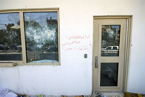 憤怒的敘民眾在美使館前示威兩天后開始圍攻使館。10日和11日,數(shù)百名民眾揮舞著敘利亞國旗,高舉總統(tǒng)阿薩德的畫像,向美使館投擲石塊、西紅柿和雞蛋,高喊“美國佬滾回去”等口號。有些示威者甚至爬上使館圍墻,拆毀鐵絲網(wǎng),將使館懸掛的美國國旗點燃焚燒,隨后將一面巨大的敘利亞國旗懸掛在美國使館入口處。