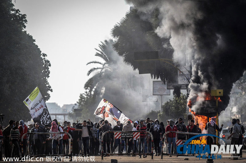 當(dāng)?shù)貢r(shí)間2014年1月12日,埃及吉薩,埃及前總統(tǒng)穆爾西的支持者與埃及安全部隊(duì)發(fā)生激烈沖突,致多人受傷。(圖片:東方IC)
