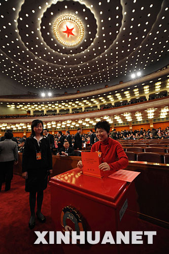 3月13日,全國(guó)政協(xié)十一屆一次會(huì)議在北京人民大會(huì)堂舉行第四次全體會(huì)議,選舉十一屆全國(guó)政協(xié)主席、副主席、秘書(shū)長(zhǎng)和常務(wù)委員。這是鄧亞萍委員在投票。新華社記者馬占成攝