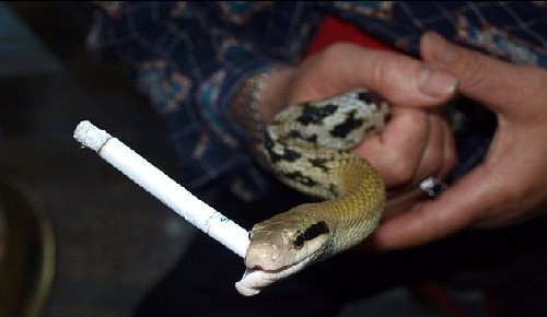 這條鼓腹毒蛇叼著煙的樣子是不是更恐怖?