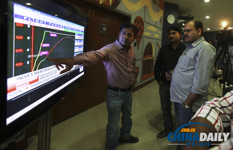 當(dāng)?shù)貢r間2013年11月5日,印度新德里,人們觀看電視屏幕上的極地衛(wèi)星運載火箭(PSLV-C25)進(jìn)程。印度首枚火星探測器“曼加里安”號在印度東海岸斯里赫里戈達(dá)島的航天發(fā)射場發(fā)射升空。(圖片來源:東方IC)