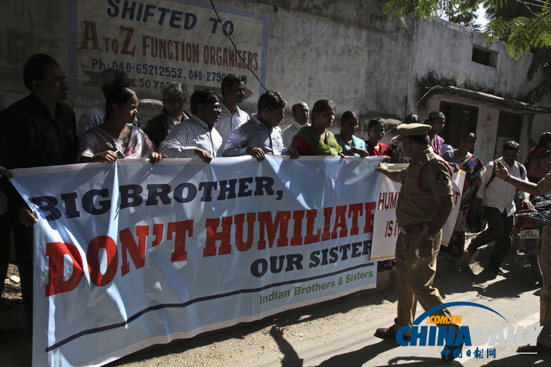 當(dāng)?shù)貢r(shí)間2013年12月18日,印度新德里,印度駐紐約大使柯布拉加德因被指控包庇印度公民提交的虛假簽證材料而遭逮捕,并在被拘留期間遭到了侮辱對(duì)待,引發(fā)印度方面的不滿。民眾憤而示威抗議。(圖片:東方IC)