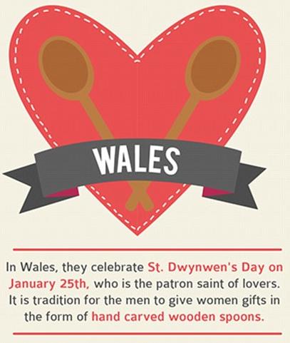威爾士的情人節(jié)是1月25日,叫做圣·杜溫節(jié),圣·杜溫是情侶的守護(hù)神。這個(gè)節(jié)日的傳統(tǒng)是男士送給女士手工雕刻的木質(zhì)勺子。