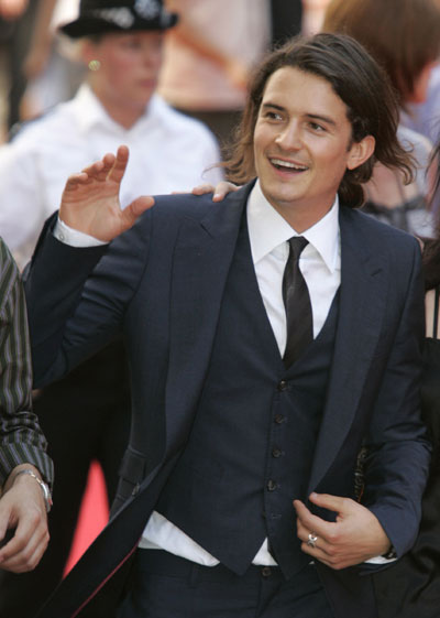 British actor Orlando Bloom waves as he arrives for the European premiere of "Pirates of the Caribbean: Dead Man's Chest" at Leicester Square, central London, July 3, 2006. (Reuters)