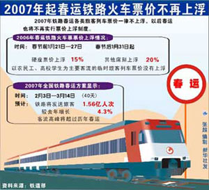 Railway Ministry spokesman Wang Yongping said Wednesday train ticket prices will not go up during the Spring Festival season, also known as the 'chunyun' period, beginning in 2007, reports the China News.