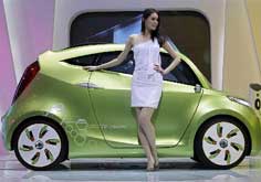 A model poses next to a Chana EV-concept electric car at the Beijing Auto Show April 23, 2010.