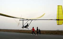 Handout photo released Tuesday shows Mao Yiqing sitting in his manpowered plane, alleged the first in China, for its maiden vovage in Fengxian District of Shanghai, March 25, 2009.