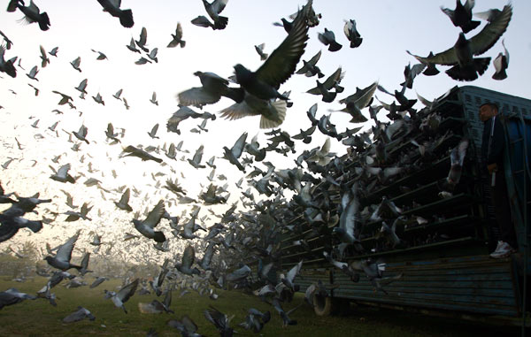 More than 60,000 pigeons set off during the 8th China Pigeon Race at the Zhengzhou Sports Center in 2007. The birds came from more than 10 provinces and municipalities. Provided to China Daily |