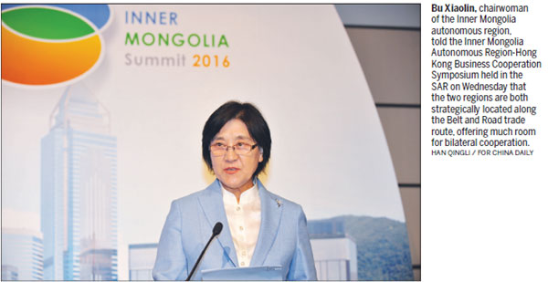 Bu Xiaolin - the region's chairwoman - told the Inner Mongolia Autonomous Region-Hong Kong Business Cooperation Symposium held in the SAR on Wednesday that the two regions are both strategically located along the Belt and Road trade route, offering much room for bilateral cooperation.