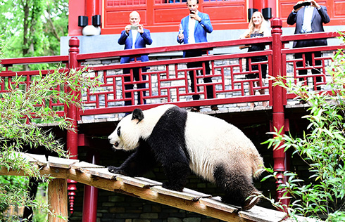 The two giant pandas living at Ouwehands Zoo enchanted hundreds of admirers in their long-awaited debut on Tuesday.