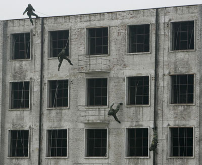Soldiers from the People's Liberation Army Unit 196 climb down from a building during a military demonstration at a base on the outskirts of north China's Tianjin municipality July 30, 2007. [Reuters]