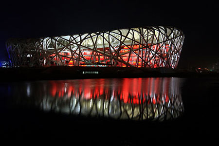 The National Stadium, or "Bird's Nest" is lit in colors at night and reflected in the water in Beijing, in this file photo dated March 3, 2008. The stadium, which will host the opening and closing ceremonies as well as the athletics events during this summer's Olympics, is almost ready for testing next month. [Asianewsphoto]