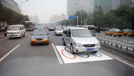 Cars drive in the Olympic Lane painted with the five rings on July 10, 2008. Beijing will open 34 Olympic Bus Lanes during the Beijing Olympics and Paralympic Games, some of which will be put into use starting from July 20, 2008. [Xinhua]