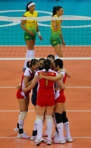 China's players (foreground) celebrate a point during the match against Brazil in the women's volleyball semifinal in the 2008 Beijing Olympic Games in Beijing on August 21, 2008.[Agencies]