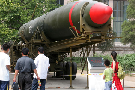 Visitors look at the DF-2 medium-range ballistic missile at an exhibition marking China's military achievements in Beijing July 16, 2007. The "Our Troops Toward The Sun" exhibit was held to celebrate the 80th anniversary of the founding of the People's Liberation Army. [newsphoto]