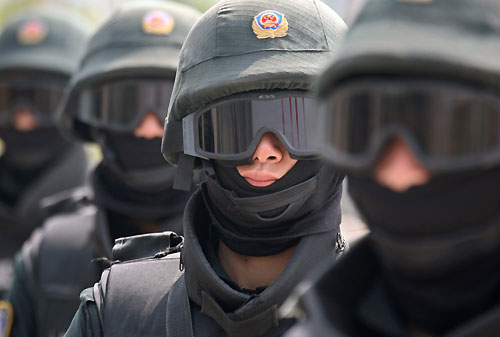 Masked members of a Chinese police SWAT team attend a ceremony to launch their Olympic security training programme in Beijing April 27, 2006. Beijing's 40,000 police officers and any more recruited before the Olympics, will take part in the training with the majority having language training to deal with the more than two million visitors expected before and during the games. [Reuters]