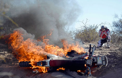 Paulo Goncalves of Portugal reacts in front of his Honda on fire during the fifth stage of the Dakar Rally 2014 from Chilecito to Tucuman, Jan 9, 2014. [Photo/Agencies] |