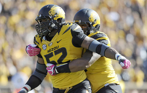 Missouri Tigers defensive lineman Michael Sam (52) is congratulated by defensive lineman Lucas Vincent (96) after sacking Florida Gators quarterback Tyler Murphy (not pictured) during the second half at Faurot Field in Columbia, Missouri in this file photo from October 19, 2013. [Photo/Agencies] |