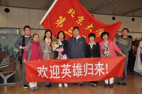Yao's colleagues welcome her home at Beijing Capital International Airport. |